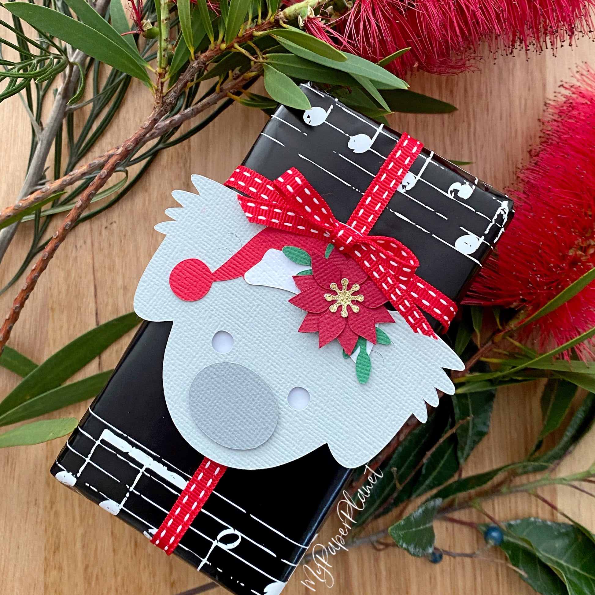 Gift tags cut from quality textured cardstock, each featuring my original Koala shape made from light grey card, with a little Christmas hat in bright red and white and a poinsettia flower in burgundy. A second tag in white is supplied as backing.