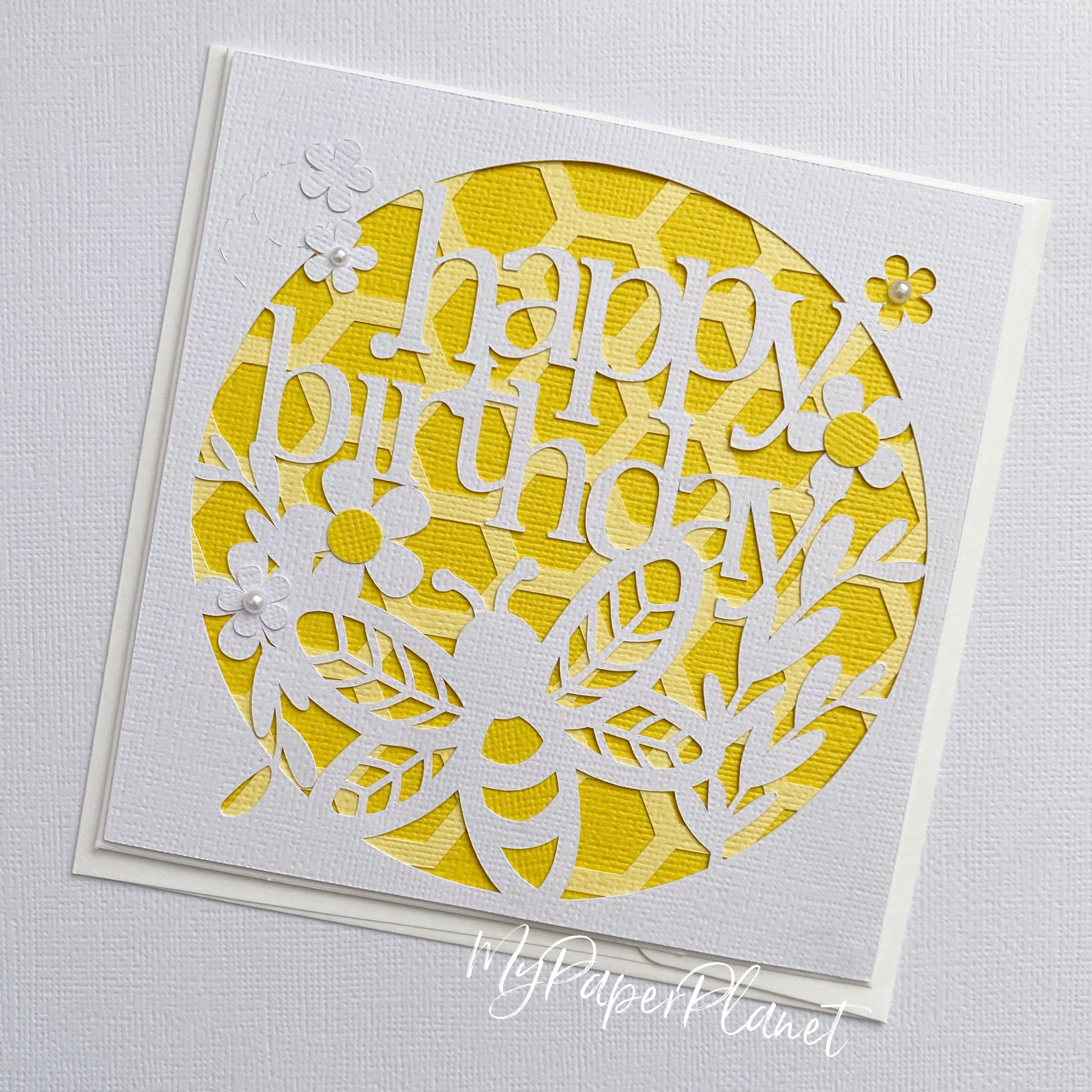 An original papercut card made from layers of textured cardstock in white and a cut-out cardstock background in yellow with a honeycomb hexagon pattern. Card features a honey bee design with flowers. Little half-pearl embellishments add dimension.