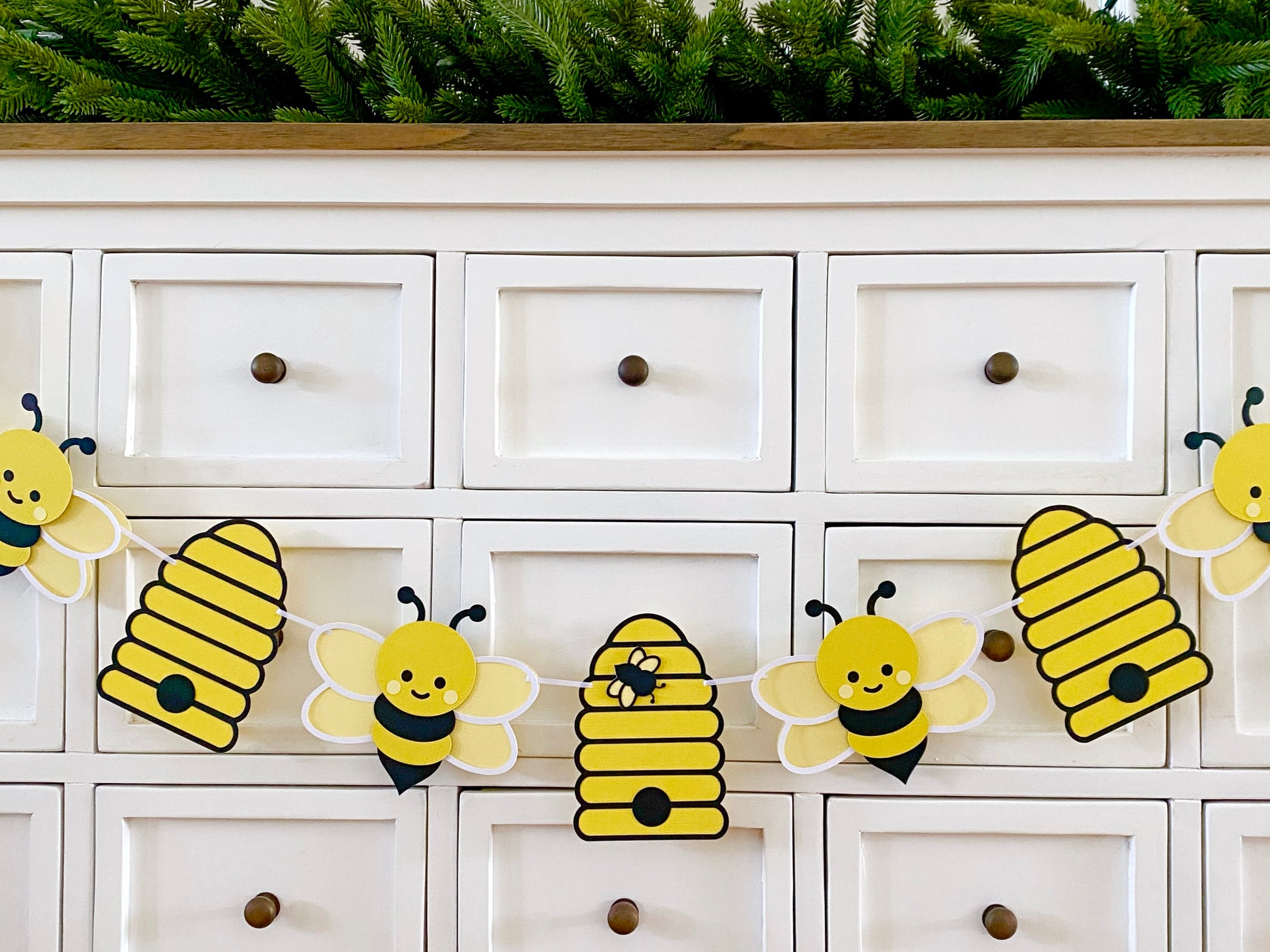 A fun banner with large bee and bee hive shapes in bright yellow and black. Bee shapes feature a smiling face and light yellow wings with white outlines.