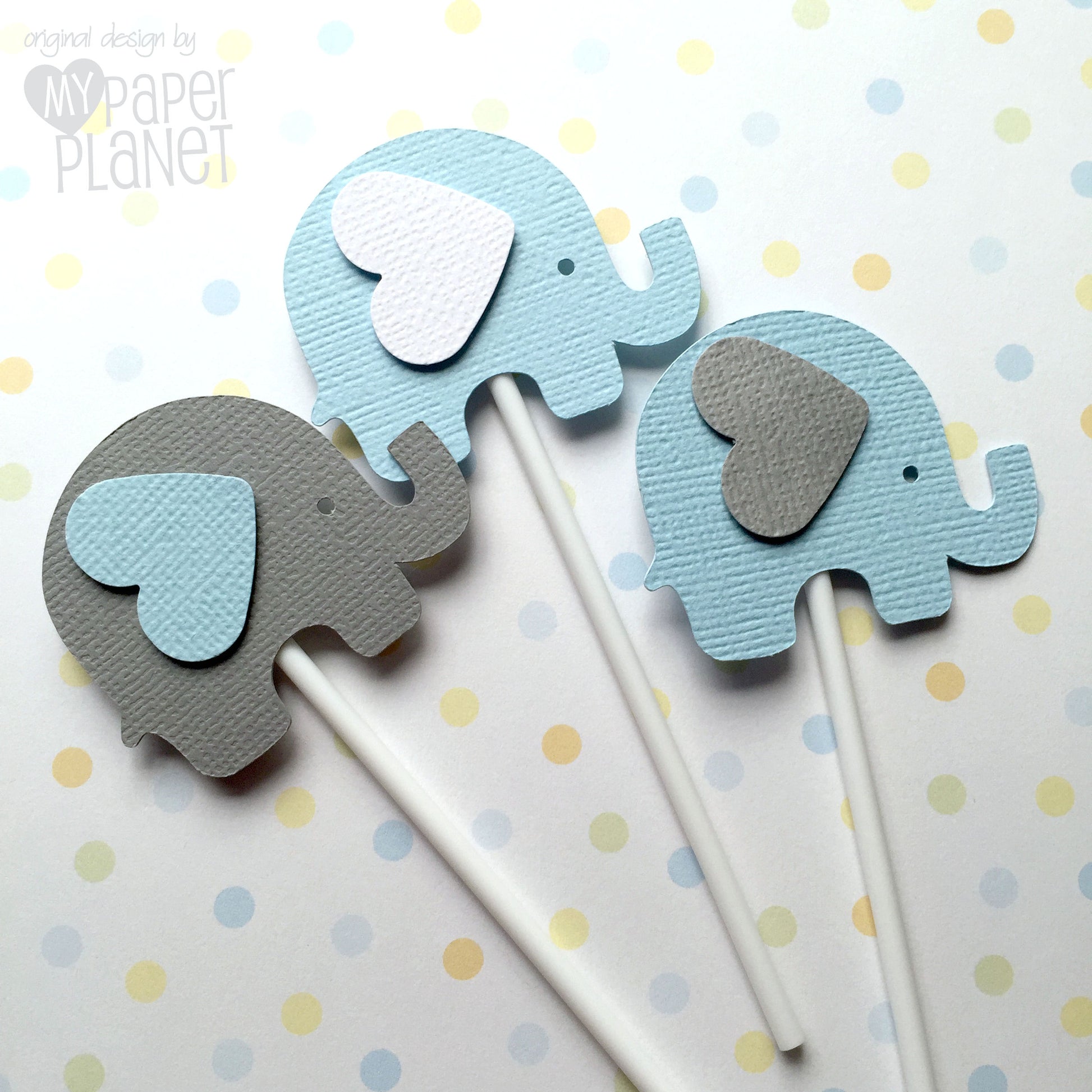 A set of 10 elephant-shaped cupcake toppers, an original design, they are precision cut from textured cardstock, with a contrasting heart-shaped ear on one side. They are single sided, and attached to a paper lollipop stick.