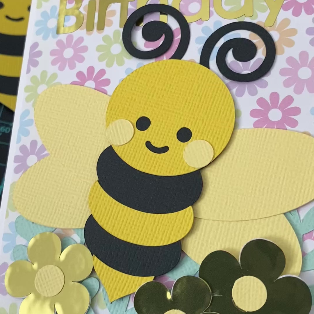 An original design made from layers of quality textured cardstock, with a black and yellow bee, and shiny metallic gold coloured text and flowers. The background features a pastel floral pattern.