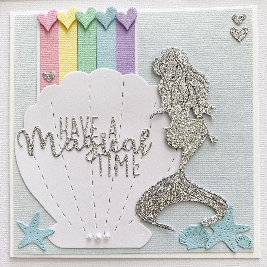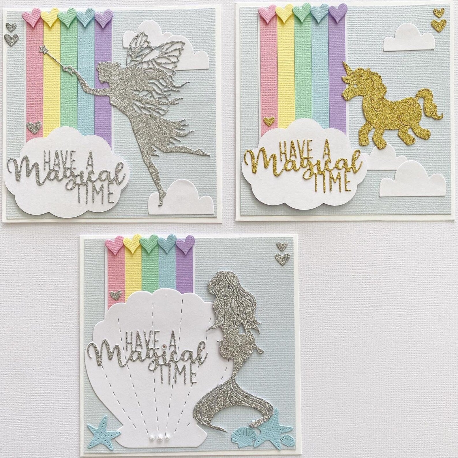 The card features a silver fairy with a little star wand on light blue background, with a pastel rainbow and cloud shapes. "Have a magical time".