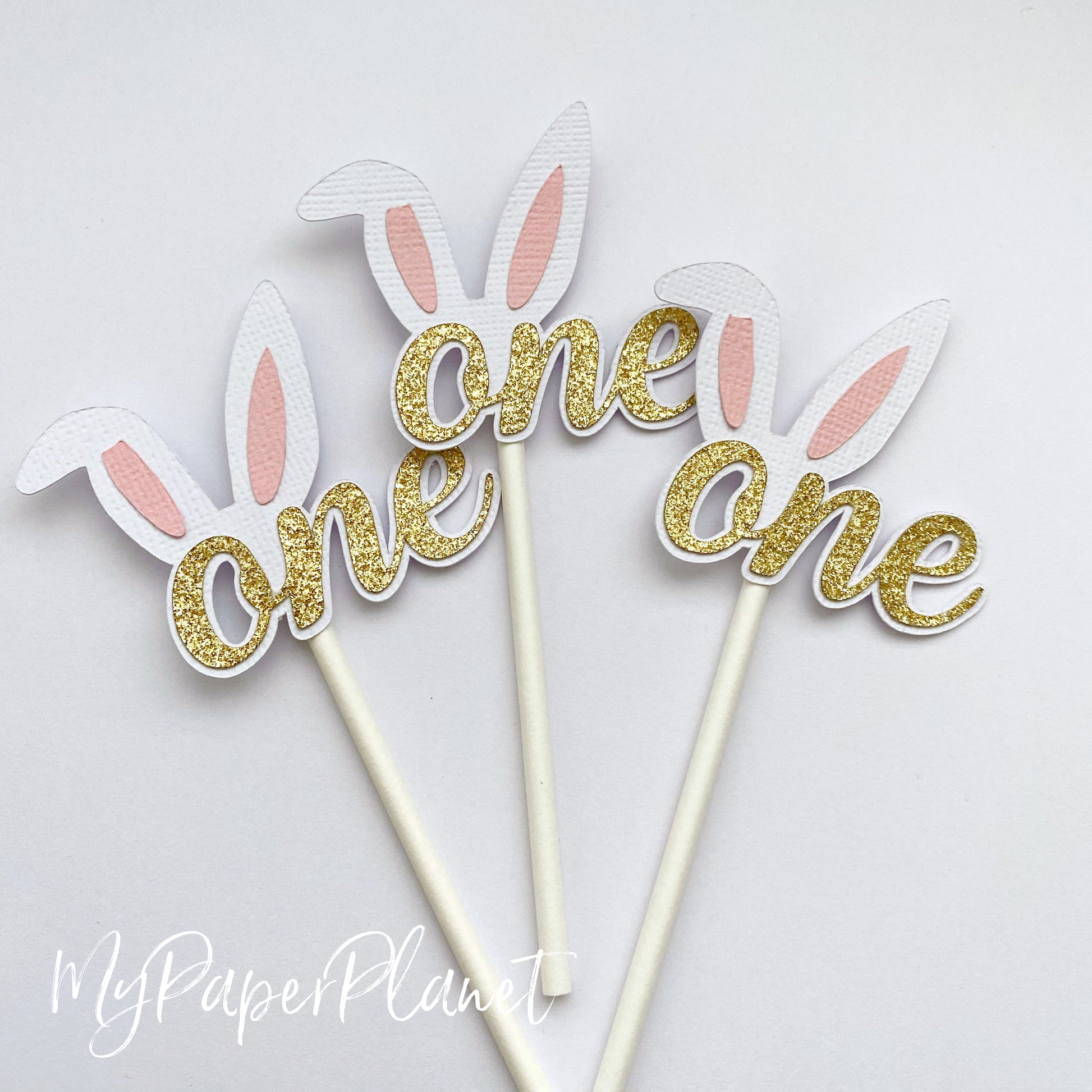 Cupcake toppers made from layers of quality cardstock. They feature "one" text in gold glitter, with pink and white bunny ears.