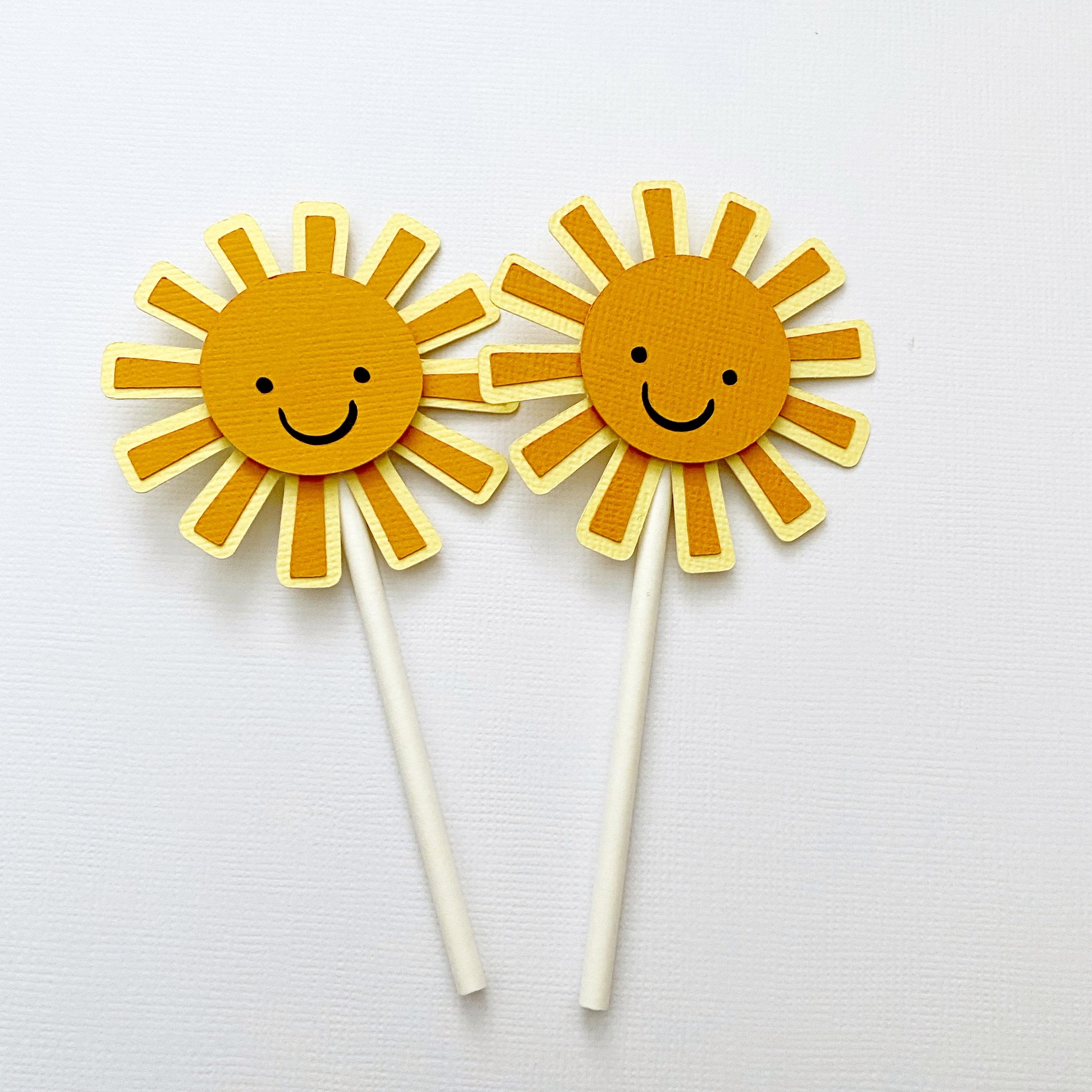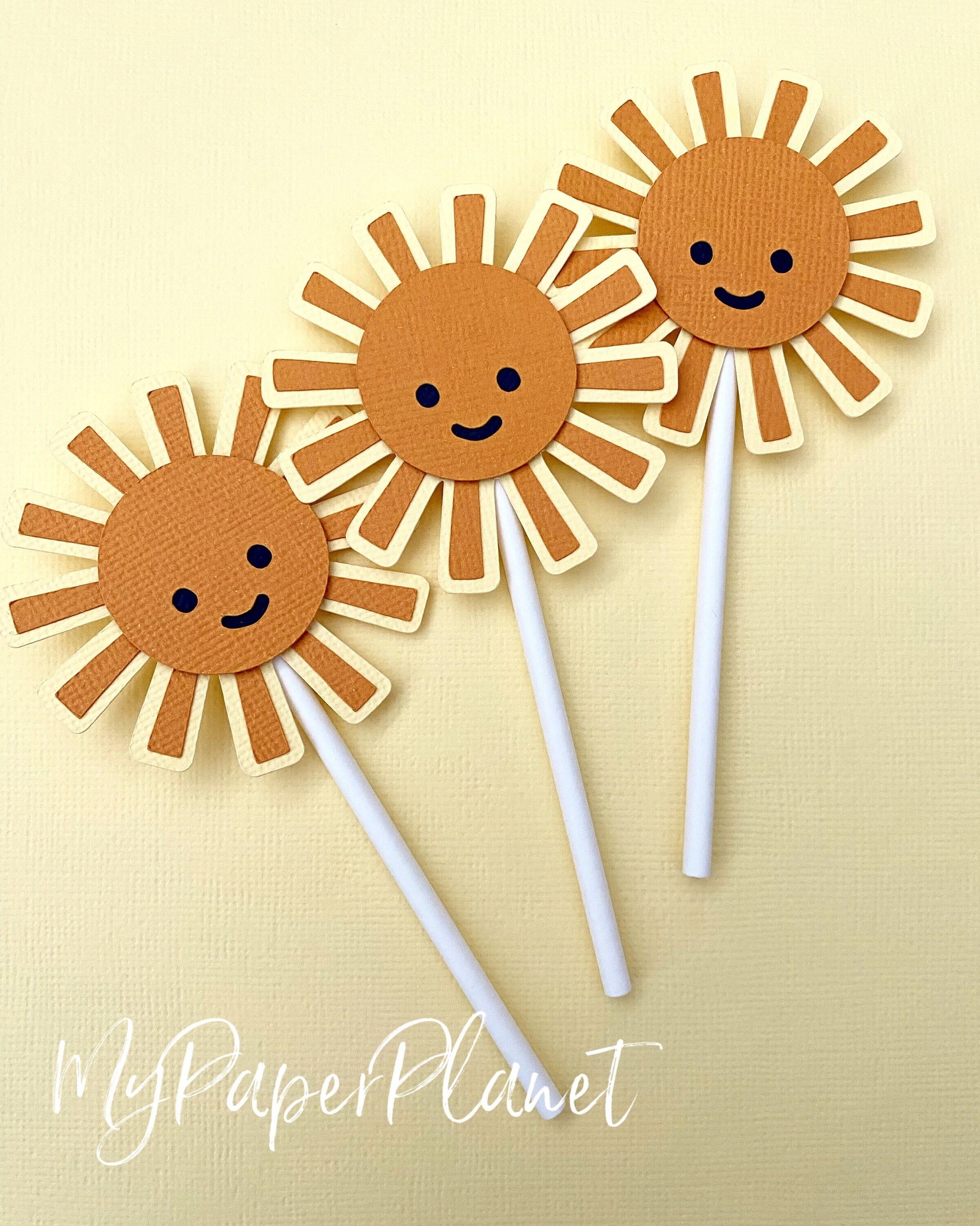 Sunshine-shaped cupcake toppers in muted orange and yellow hues, made from layers of quality textured cardstock, featuring a smiley face.