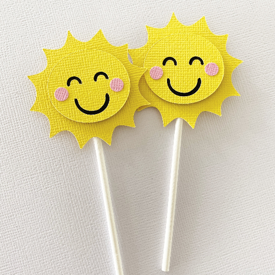 Sunshine-shaped cupcake toppers in bright yellow made from layers of quality textured cardstock. They feature a smiley face with pink cheek spots.