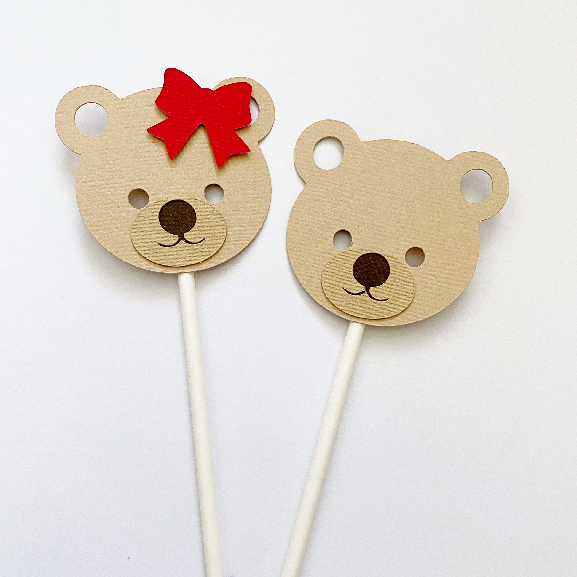 Sweet little teddy bear cupcake toppers made from layers of quality cardstock in light brown, with darker brown face details and cut-out eyes.