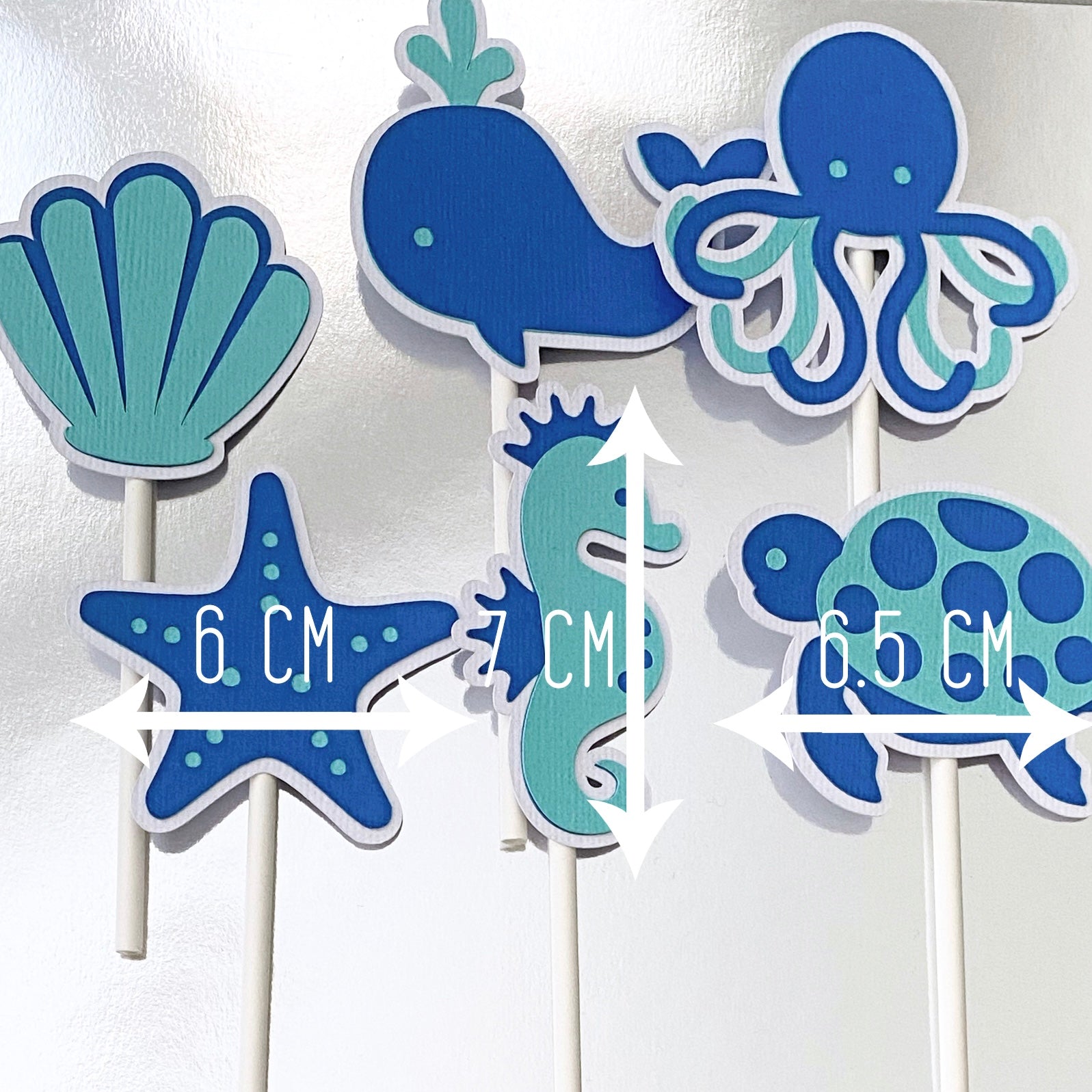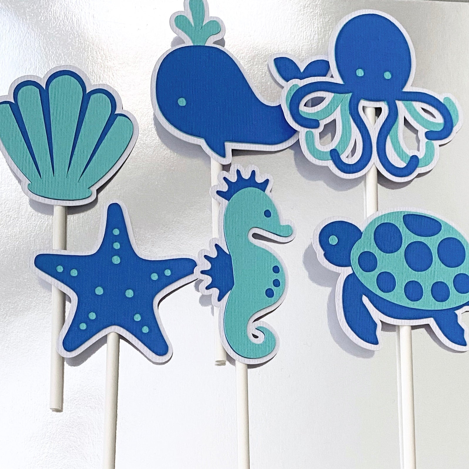 A set of 12 cupcake toppers, including two of each: Whale, Turtle, Starfish, Shell, Octopus and Sea Horse.